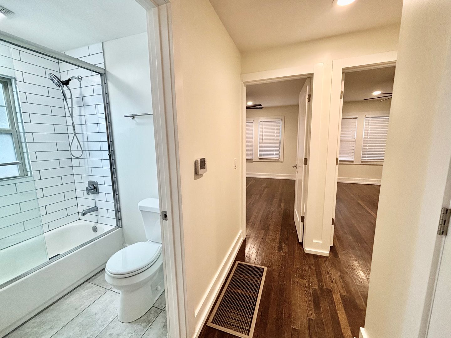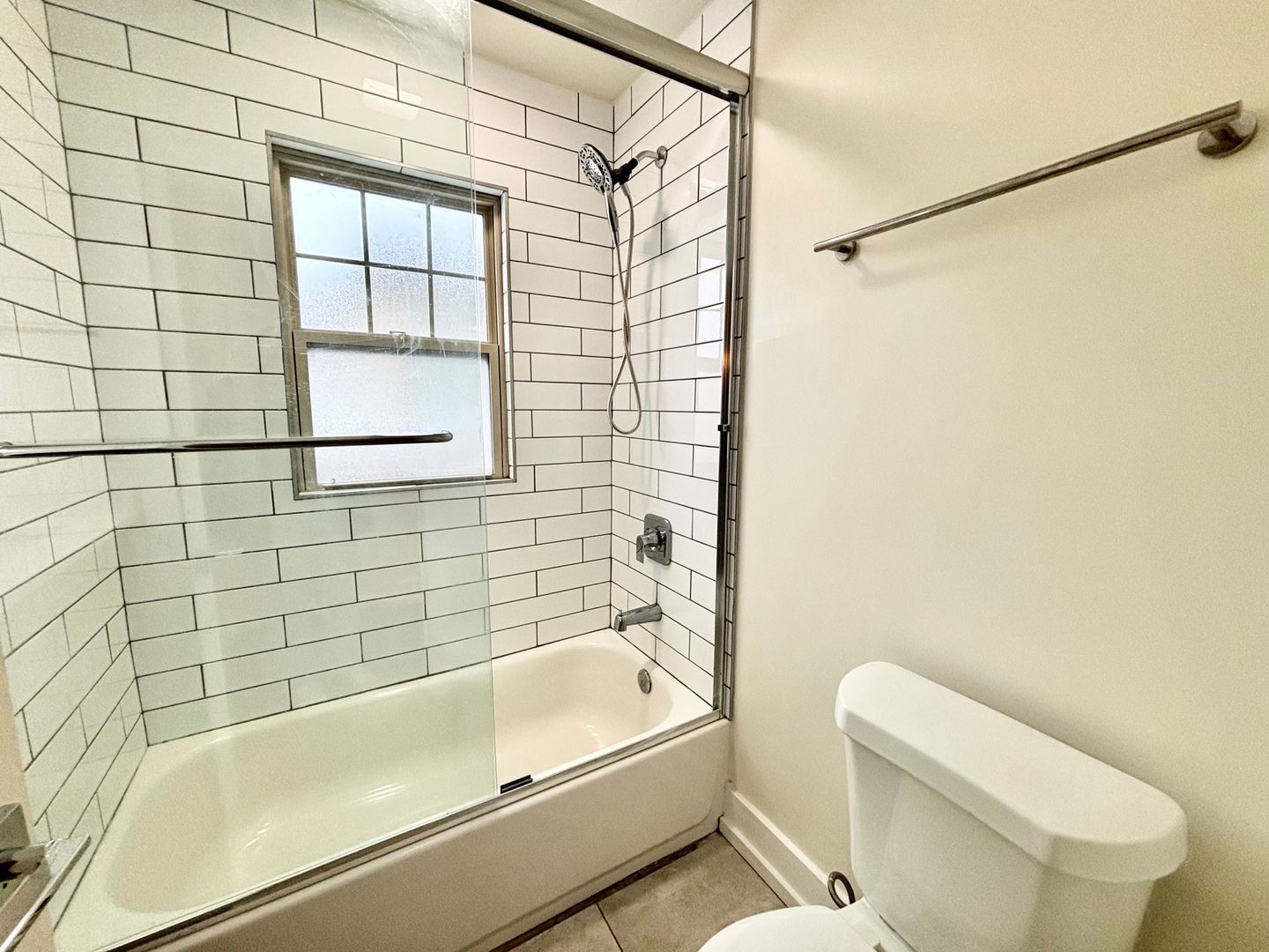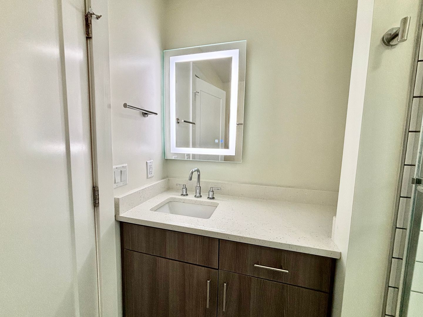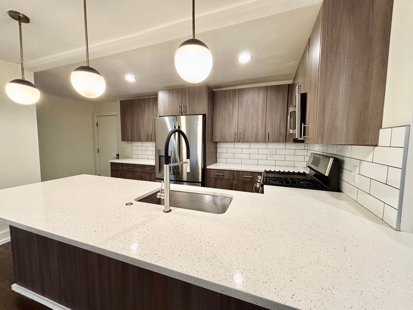 The modern kitchen features a central island, stainless steel appliances, and plenty of cabinet space. In-unit laundry is included for everyday convenience. The main bedroom includes a generous walk-in closet, while the updated bathroom offers a glass-enclosed shower, bright lighting, and a contemporary mirror.