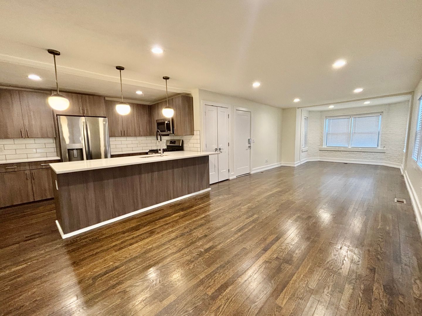 Welcome to this stylish second-floor 2-bedroom unit, ideally located in the vibrant Plaza area. Enjoy the warmth and sophistication of dark-stained hardwood floors throughout, paired with a spacious living and dining area perfect for relaxing or entertaining.