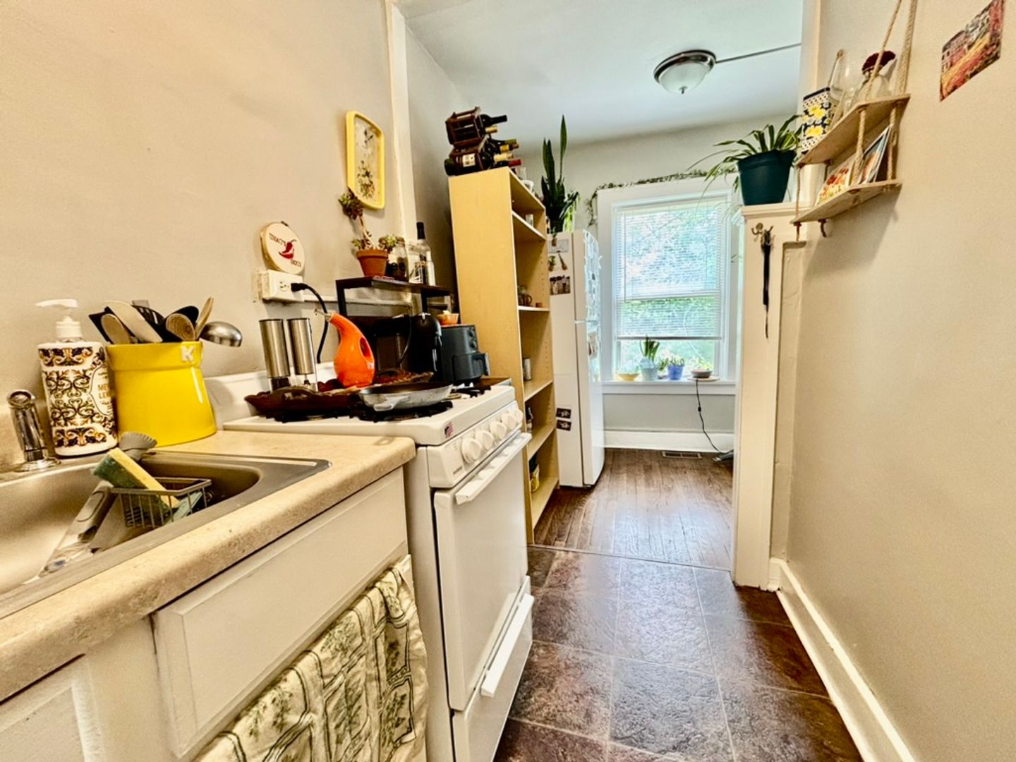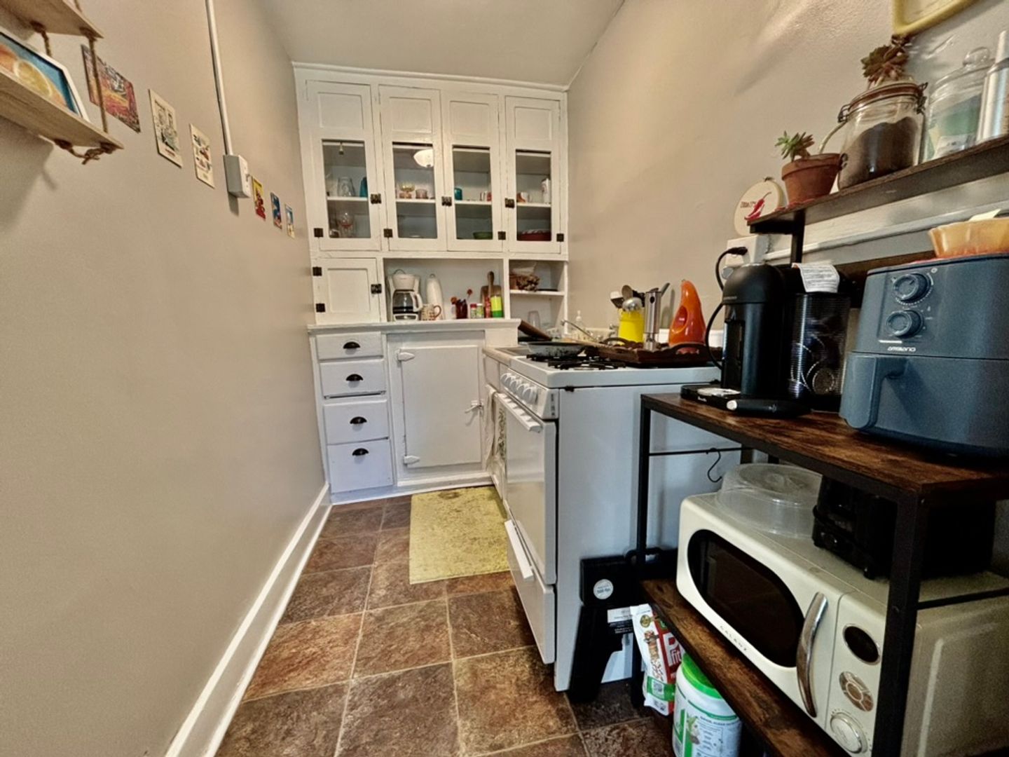 This first floor unit features beautiful hardwood floors throughout and offers a cozy and inviting atmosphere. The small galley kitchen retains its original built-in cabinets, complemented by a new kitchen sink, along with a newer apartment-sized gas stove and refrigerator.