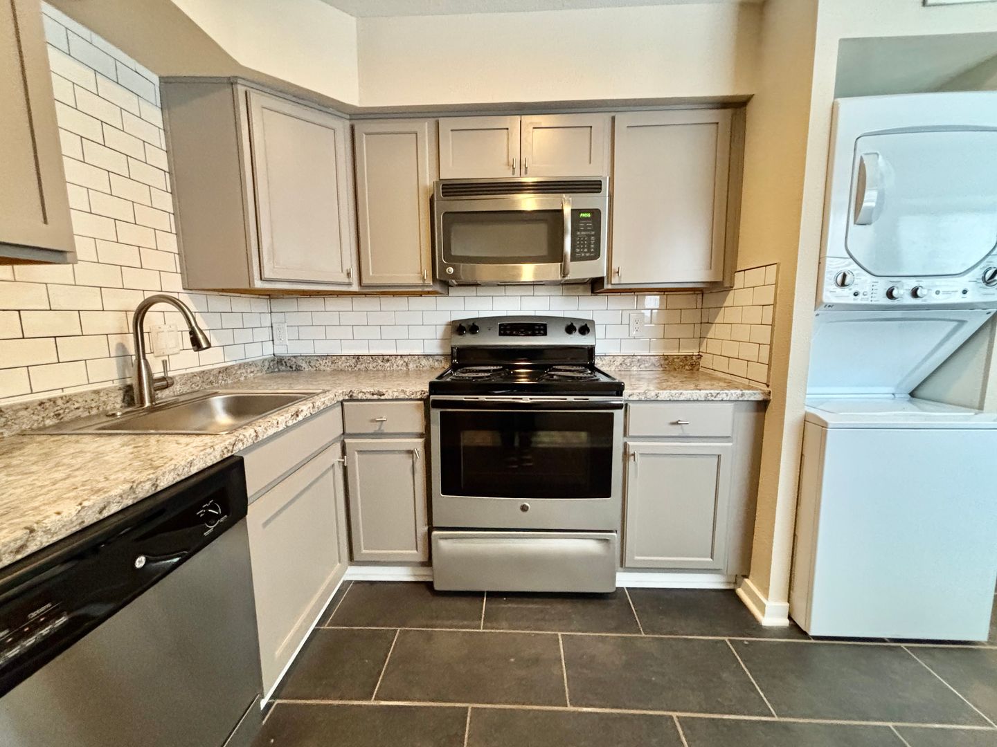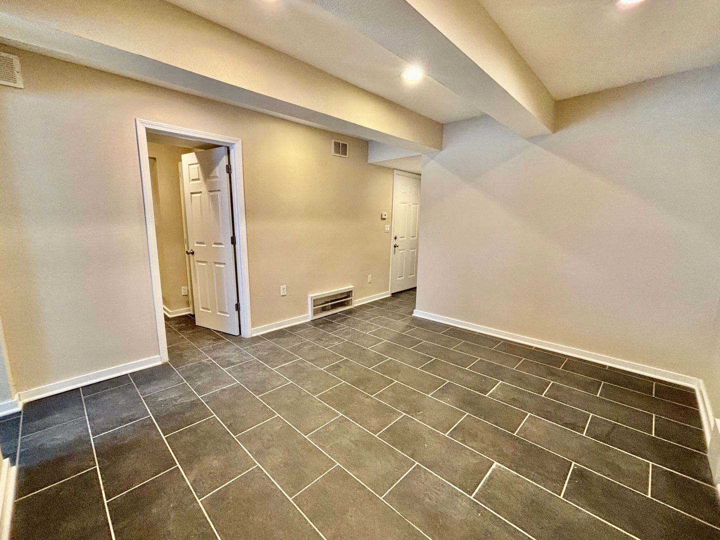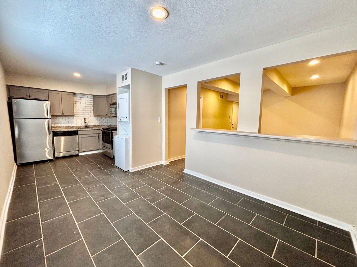 Inside, you'll find a spacious ground-level 1-bedroom apartment. This home features sleek tile flooring throughout, an open layout with plenty of room to relax, and a cozy dining nook right off the kitchen—perfect for meals or a small workspace. Enjoy the added ease of in-unit laundry, plus off-street parking for stress-free coming and going. A great blend of practicality and charm, ready for you to call home!