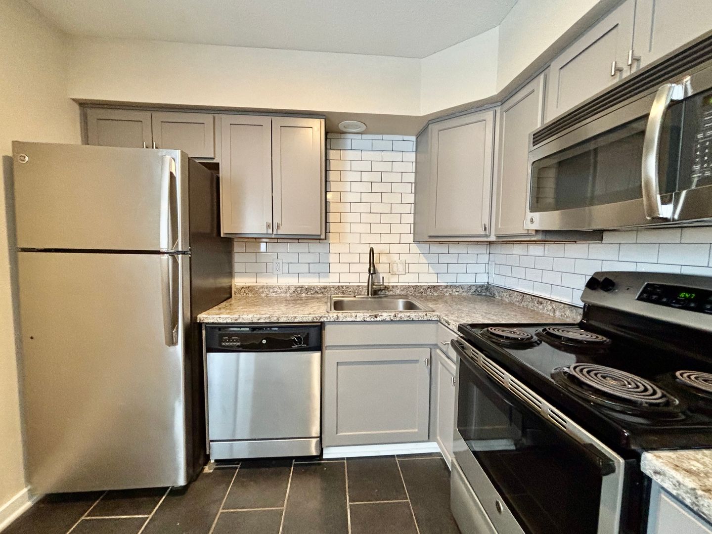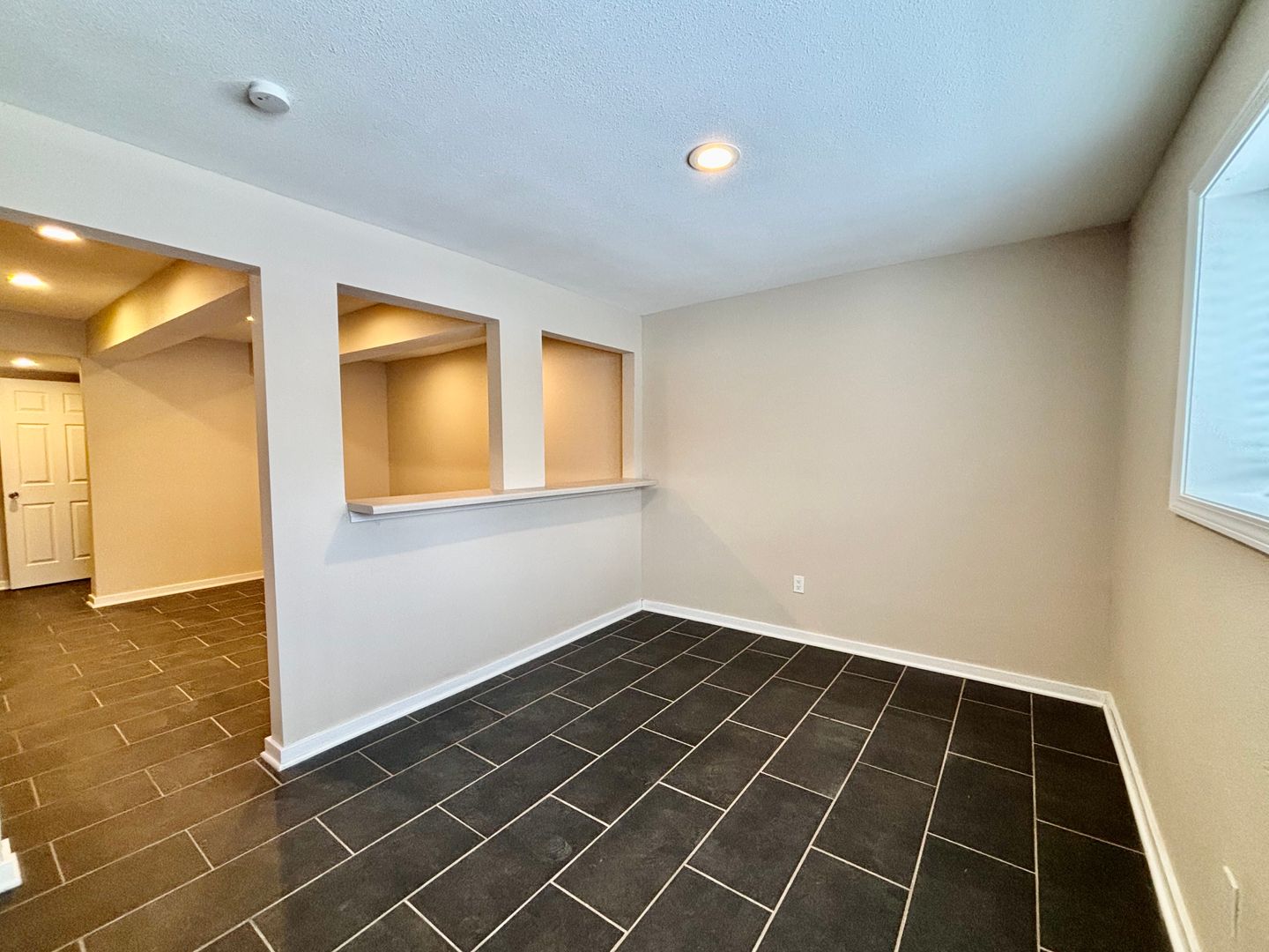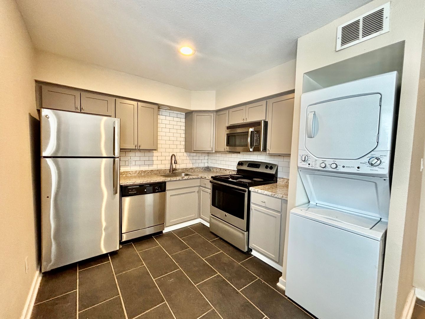 Inside, you'll find a spacious ground-level 1-bedroom apartment. This home features sleek tile flooring throughout, an open layout with plenty of room to relax, and a cozy dining nook right off the kitchen—perfect for meals or a small workspace. Enjoy the added ease of in-unit laundry, plus off-street parking for stress-free coming and going. A great blend of practicality and charm, ready for you to call home!